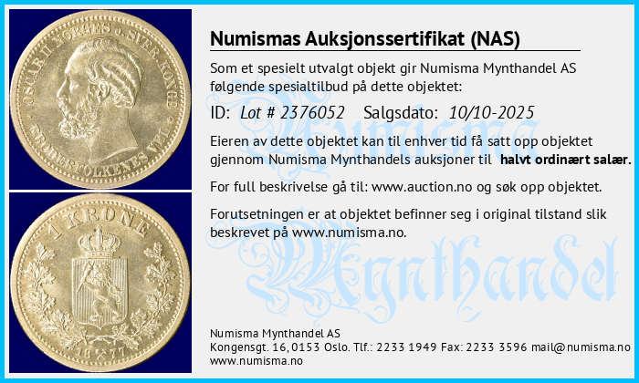 Numismas Auksjonssertifikat (NAS) gis til mynter vi mener utmerker seg. Objekter med et slikt sertifikat er særlig verdifulle, sjeldne eller av spesiell interesse for samlere. Numisma Mynthandel AS utsteder sertifikatet på selvstendig basis. Det gir deg som eier av mynten en ekstra trygghet, og en garanti dersom du velger å videreselge mynten. Vi lar sertifikatet følge mynten. På denne siden finner du en oversikt over alle objekter med auksjonssertifikat. Her kan du sjekke opplysningene om mynten og skrive ut din egen kopi av sertifikatet. Full beskrivelse av objekter finner du på: https://www.auction.no/no/old.php.