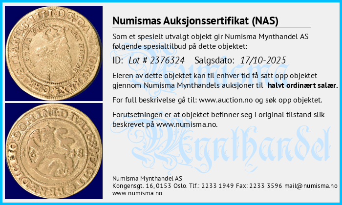 Numismas Auksjonssertifikat (NAS) gis til mynter vi mener utmerker seg. Objekter med et slikt sertifikat er særlig verdifulle, sjeldne eller av spesiell interesse for samlere. Numisma Mynthandel AS utsteder sertifikatet på selvstendig basis. Det gir deg som eier av mynten en ekstra trygghet, og en garanti dersom du velger å videreselge mynten. Vi lar sertifikatet følge mynten. På denne siden finner du en oversikt over alle objekter med auksjonssertifikat. Her kan du sjekke opplysningene om mynten og skrive ut din egen kopi av sertifikatet. Full beskrivelse av objekter finner du på: https://www.auction.no/no/old.php.