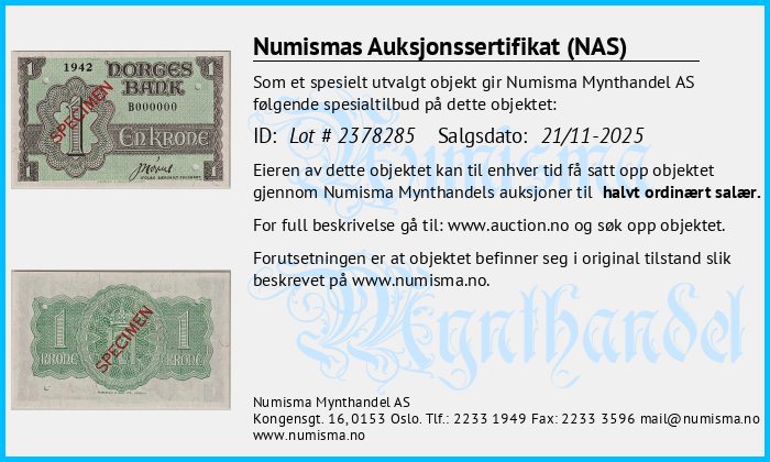 Numismas Auksjonssertifikat (NAS) gis til mynter vi mener utmerker seg. Objekter med et slikt sertifikat er særlig verdifulle, sjeldne eller av spesiell interesse for samlere. Numisma Mynthandel AS utsteder sertifikatet på selvstendig basis. Det gir deg som eier av mynten en ekstra trygghet, og en garanti dersom du velger å videreselge mynten. Vi lar sertifikatet følge mynten. På denne siden finner du en oversikt over alle objekter med auksjonssertifikat. Her kan du sjekke opplysningene om mynten og skrive ut din egen kopi av sertifikatet. Full beskrivelse av objekter finner du på: https://www.auction.no/no/old.php.