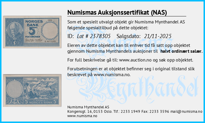 Numismas Auksjonssertifikat (NAS) gis til mynter vi mener utmerker seg. Objekter med et slikt sertifikat er særlig verdifulle, sjeldne eller av spesiell interesse for samlere. Numisma Mynthandel AS utsteder sertifikatet på selvstendig basis. Det gir deg som eier av mynten en ekstra trygghet, og en garanti dersom du velger å videreselge mynten. Vi lar sertifikatet følge mynten. På denne siden finner du en oversikt over alle objekter med auksjonssertifikat. Her kan du sjekke opplysningene om mynten og skrive ut din egen kopi av sertifikatet. Full beskrivelse av objekter finner du på: https://www.auction.no/no/old.php.