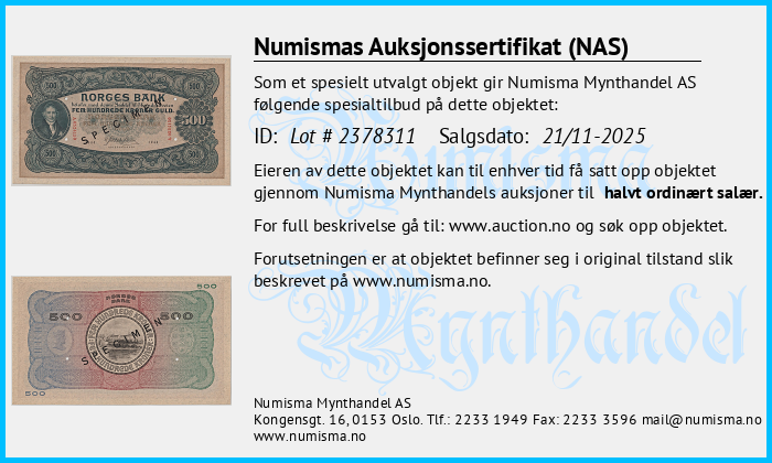 Numismas Auksjonssertifikat (NAS) gis til mynter vi mener utmerker seg. Objekter med et slikt sertifikat er særlig verdifulle, sjeldne eller av spesiell interesse for samlere. Numisma Mynthandel AS utsteder sertifikatet på selvstendig basis. Det gir deg som eier av mynten en ekstra trygghet, og en garanti dersom du velger å videreselge mynten. Vi lar sertifikatet følge mynten. På denne siden finner du en oversikt over alle objekter med auksjonssertifikat. Her kan du sjekke opplysningene om mynten og skrive ut din egen kopi av sertifikatet. Full beskrivelse av objekter finner du på: https://www.auction.no/no/old.php.