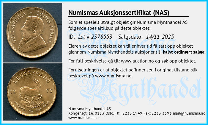 Numismas Auksjonssertifikat (NAS) gis til mynter vi mener utmerker seg. Objekter med et slikt sertifikat er særlig verdifulle, sjeldne eller av spesiell interesse for samlere. Numisma Mynthandel AS utsteder sertifikatet på selvstendig basis. Det gir deg som eier av mynten en ekstra trygghet, og en garanti dersom du velger å videreselge mynten. Vi lar sertifikatet følge mynten. På denne siden finner du en oversikt over alle objekter med auksjonssertifikat. Her kan du sjekke opplysningene om mynten og skrive ut din egen kopi av sertifikatet. Full beskrivelse av objekter finner du på: https://www.auction.no/no/old.php.