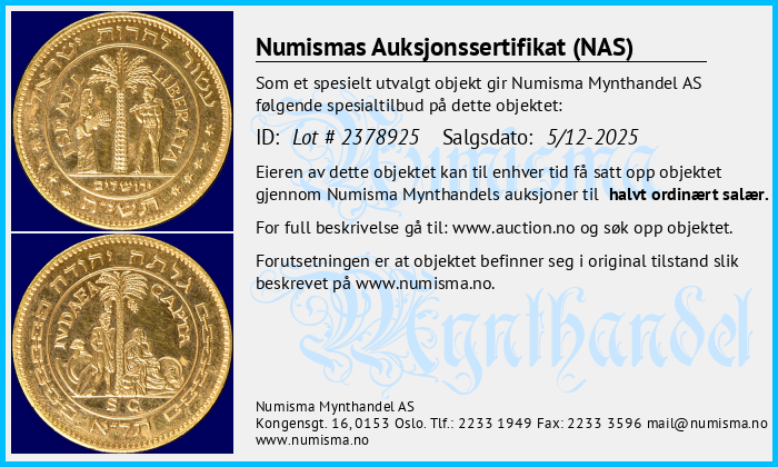 Numismas Auksjonssertifikat (NAS) gis til mynter vi mener utmerker seg. Objekter med et slikt sertifikat er særlig verdifulle, sjeldne eller av spesiell interesse for samlere. Numisma Mynthandel AS utsteder sertifikatet på selvstendig basis. Det gir deg som eier av mynten en ekstra trygghet, og en garanti dersom du velger å videreselge mynten. Vi lar sertifikatet følge mynten. På denne siden finner du en oversikt over alle objekter med auksjonssertifikat. Her kan du sjekke opplysningene om mynten og skrive ut din egen kopi av sertifikatet. Full beskrivelse av objekter finner du på: https://www.auction.no/no/old.php.