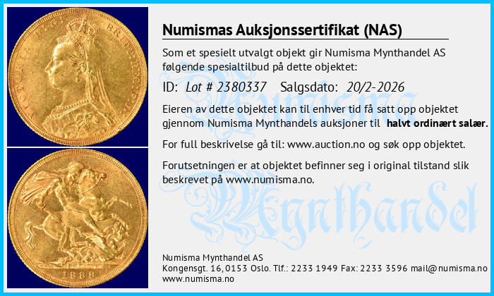 Numismas Auksjonssertifikat (NAS) gis til mynter vi mener utmerker seg. Objekter med et slikt sertifikat er særlig verdifulle, sjeldne eller av spesiell interesse for samlere. Numisma Mynthandel AS utsteder sertifikatet på selvstendig basis. Det gir deg som eier av mynten en ekstra trygghet, og en garanti dersom du velger å videreselge mynten. Vi lar sertifikatet følge mynten. På denne siden finner du en oversikt over alle objekter med auksjonssertifikat. Her kan du sjekke opplysningene om mynten og skrive ut din egen kopi av sertifikatet. Full beskrivelse av objekter finner du på: https://www.auction.no/no/old.php.