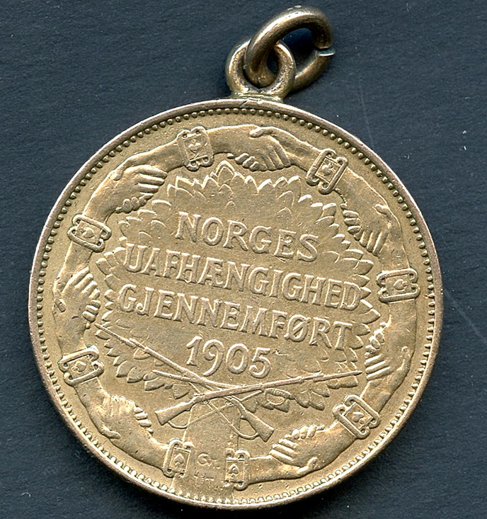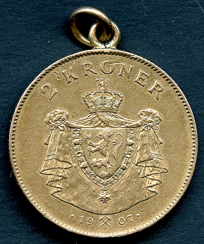 2379855: -8- 2 krone 1907 gevær, kv. 1, anhengt, forgyldt.