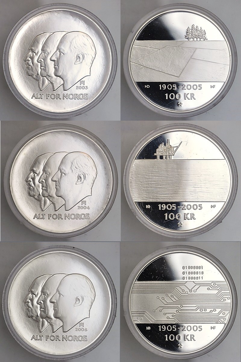 Tre stykk 1500 kr gull og tre stk 100 kr sølv til minne om 1905.