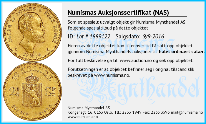 Numismas Auksjonssertifikat (NAS) gis til mynter vi mener utmerker seg. Objekter med et slikt sertifikat er særlig verdifulle, sjeldne eller av spesiell interesse for samlere. Numisma Mynthandel AS utsteder sertifikatet på selvstendig basis. Det gir deg som eier av mynten en ekstra trygghet, og en garanti dersom du velger å videreselge mynten. Vi lar sertifikatet følge mynten. På denne siden finner du en oversikt over alle objekter med auksjonssertifikat. Her kan du sjekke opplysningene om mynten og skrive ut din egen kopi av sertifikatet. Full beskrivelse av objekter finner du på: https://www.auction.no/no/old.php.