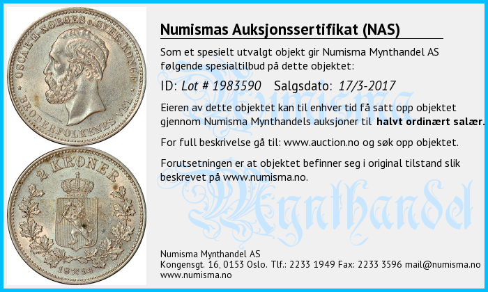 Numismas Auksjonssertifikat (NAS) gis til mynter vi mener utmerker seg. Objekter med et slikt sertifikat er særlig verdifulle, sjeldne eller av spesiell interesse for samlere. Numisma Mynthandel AS utsteder sertifikatet på selvstendig basis. Det gir deg som eier av mynten en ekstra trygghet, og en garanti dersom du velger å videreselge mynten. Vi lar sertifikatet følge mynten. På denne siden finner du en oversikt over alle objekter med auksjonssertifikat. Her kan du sjekke opplysningene om mynten og skrive ut din egen kopi av sertifikatet. Full beskrivelse av objekter finner du på: https://www.auction.no/no/old.php.