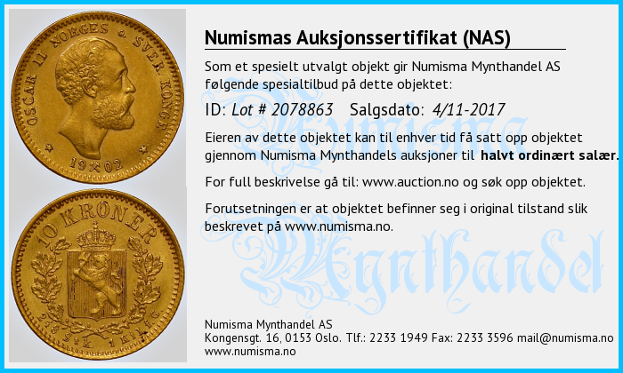 Numismas Auksjonssertifikat (NAS) gis til mynter vi mener utmerker seg. Objekter med et slikt sertifikat er særlig verdifulle, sjeldne eller av spesiell interesse for samlere. Numisma Mynthandel AS utsteder sertifikatet på selvstendig basis. Det gir deg som eier av mynten en ekstra trygghet, og en garanti dersom du velger å videreselge mynten. Vi lar sertifikatet følge mynten. På denne siden finner du en oversikt over alle objekter med auksjonssertifikat. Her kan du sjekke opplysningene om mynten og skrive ut din egen kopi av sertifikatet. Full beskrivelse av objekter finner du på: https://www.auction.no/no/old.php.
