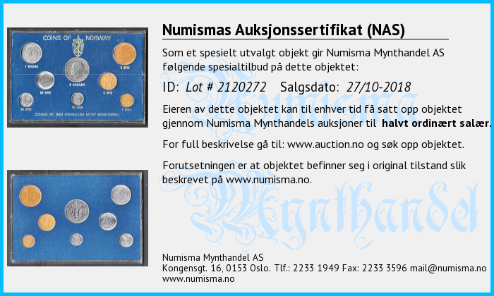 Numismas Auksjonssertifikat (NAS) gis til mynter vi mener utmerker seg. Objekter med et slikt sertifikat er særlig verdifulle, sjeldne eller av spesiell interesse for samlere. Numisma Mynthandel AS utsteder sertifikatet på selvstendig basis. Det gir deg som eier av mynten en ekstra trygghet, og en garanti dersom du velger å videreselge mynten. Vi lar sertifikatet følge mynten. På denne siden finner du en oversikt over alle objekter med auksjonssertifikat. Her kan du sjekke opplysningene om mynten og skrive ut din egen kopi av sertifikatet. Full beskrivelse av objekter finner du på: https://www.auction.no/no/old.php.