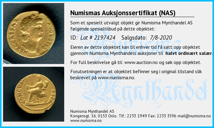 Numismas Auksjonssertifikat (NAS) gis til mynter vi mener utmerker seg. Objekter med et slikt sertifikat er særlig verdifulle, sjeldne eller av spesiell interesse for samlere. Numisma Mynthandel AS utsteder sertifikatet på selvstendig basis. Det gir deg som eier av mynten en ekstra trygghet, og en garanti dersom du velger å videreselge mynten. Vi lar sertifikatet følge mynten. På denne siden finner du en oversikt over alle objekter med auksjonssertifikat. Her kan du sjekke opplysningene om mynten og skrive ut din egen kopi av sertifikatet. Full beskrivelse av objekter finner du på: https://www.auction.no/no/old.php.