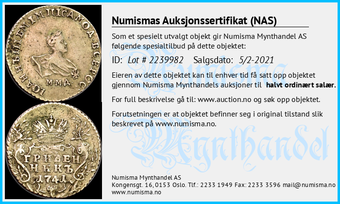 Numismas Auksjonssertifikat (NAS) gis til mynter vi mener utmerker seg. Objekter med et slikt sertifikat er særlig verdifulle, sjeldne eller av spesiell interesse for samlere. Numisma Mynthandel AS utsteder sertifikatet på selvstendig basis. Det gir deg som eier av mynten en ekstra trygghet, og en garanti dersom du velger å videreselge mynten. Vi lar sertifikatet følge mynten. På denne siden finner du en oversikt over alle objekter med auksjonssertifikat. Her kan du sjekke opplysningene om mynten og skrive ut din egen kopi av sertifikatet. Full beskrivelse av objekter finner du på: https://www.auction.no/no/old.php.