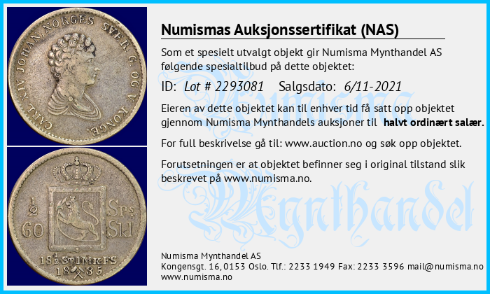 Numismas Auksjonssertifikat (NAS) gis til mynter vi mener utmerker seg. Objekter med et slikt sertifikat er særlig verdifulle, sjeldne eller av spesiell interesse for samlere. Numisma Mynthandel AS utsteder sertifikatet på selvstendig basis. Det gir deg som eier av mynten en ekstra trygghet, og en garanti dersom du velger å videreselge mynten. Vi lar sertifikatet følge mynten. På denne siden finner du en oversikt over alle objekter med auksjonssertifikat. Her kan du sjekke opplysningene om mynten og skrive ut din egen kopi av sertifikatet. Full beskrivelse av objekter finner du på: https://www.auction.no/no/old.php.