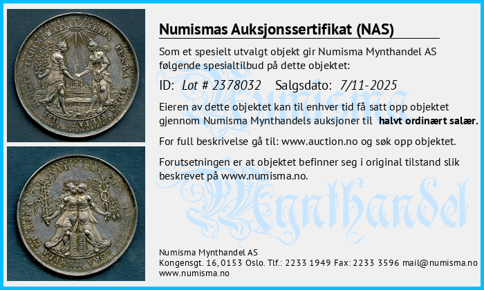 Numismas Auksjonssertifikat (NAS) gis til mynter vi mener utmerker seg. Objekter med et slikt sertifikat er særlig verdifulle, sjeldne eller av spesiell interesse for samlere. Numisma Mynthandel AS utsteder sertifikatet på selvstendig basis. Det gir deg som eier av mynten en ekstra trygghet, og en garanti dersom du velger å videreselge mynten. Vi lar sertifikatet følge mynten. På denne siden finner du en oversikt over alle objekter med auksjonssertifikat. Her kan du sjekke opplysningene om mynten og skrive ut din egen kopi av sertifikatet. Full beskrivelse av objekter finner du på: https://www.auction.no/no/old.php.