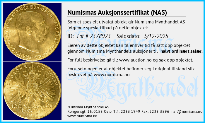 Numismas Auksjonssertifikat (NAS) gis til mynter vi mener utmerker seg. Objekter med et slikt sertifikat er særlig verdifulle, sjeldne eller av spesiell interesse for samlere. Numisma Mynthandel AS utsteder sertifikatet på selvstendig basis. Det gir deg som eier av mynten en ekstra trygghet, og en garanti dersom du velger å videreselge mynten. Vi lar sertifikatet følge mynten. På denne siden finner du en oversikt over alle objekter med auksjonssertifikat. Her kan du sjekke opplysningene om mynten og skrive ut din egen kopi av sertifikatet. Full beskrivelse av objekter finner du på: https://www.auction.no/no/old.php.