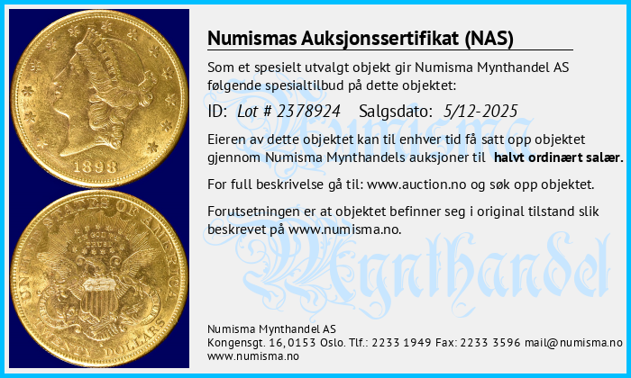 Numismas Auksjonssertifikat (NAS) gis til mynter vi mener utmerker seg. Objekter med et slikt sertifikat er særlig verdifulle, sjeldne eller av spesiell interesse for samlere. Numisma Mynthandel AS utsteder sertifikatet på selvstendig basis. Det gir deg som eier av mynten en ekstra trygghet, og en garanti dersom du velger å videreselge mynten. Vi lar sertifikatet følge mynten. På denne siden finner du en oversikt over alle objekter med auksjonssertifikat. Her kan du sjekke opplysningene om mynten og skrive ut din egen kopi av sertifikatet. Full beskrivelse av objekter finner du på: https://www.auction.no/no/old.php.