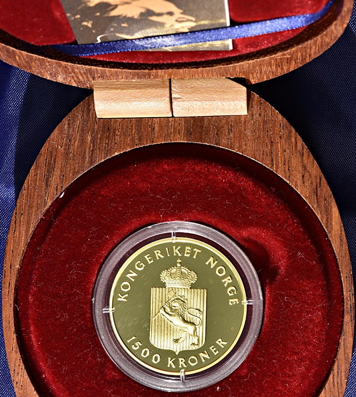 Mynten kommer i original forpakning m/sertifikat. 15,55 gr. rent gull. ø27mm.