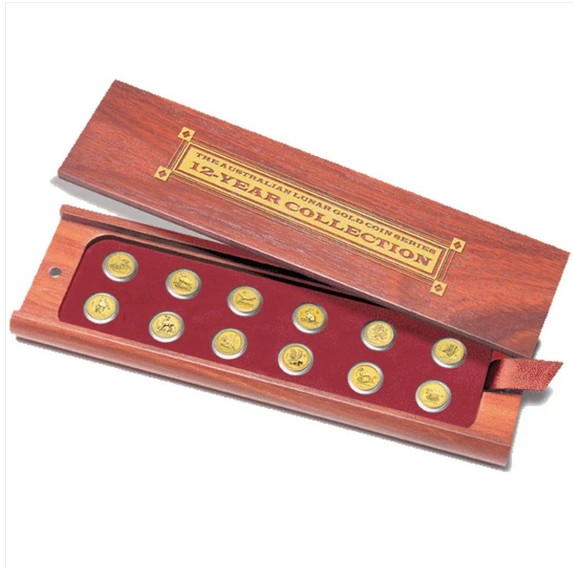 The australian lunar gold coin series, 12 year collection. 12 x 5 dollars 1996-2007. 1/20 oz, .9999 rent gull. ø14mm. Samtals 0,6 oz gull. Kommer i et originalt skrin, m/sertifikat.
